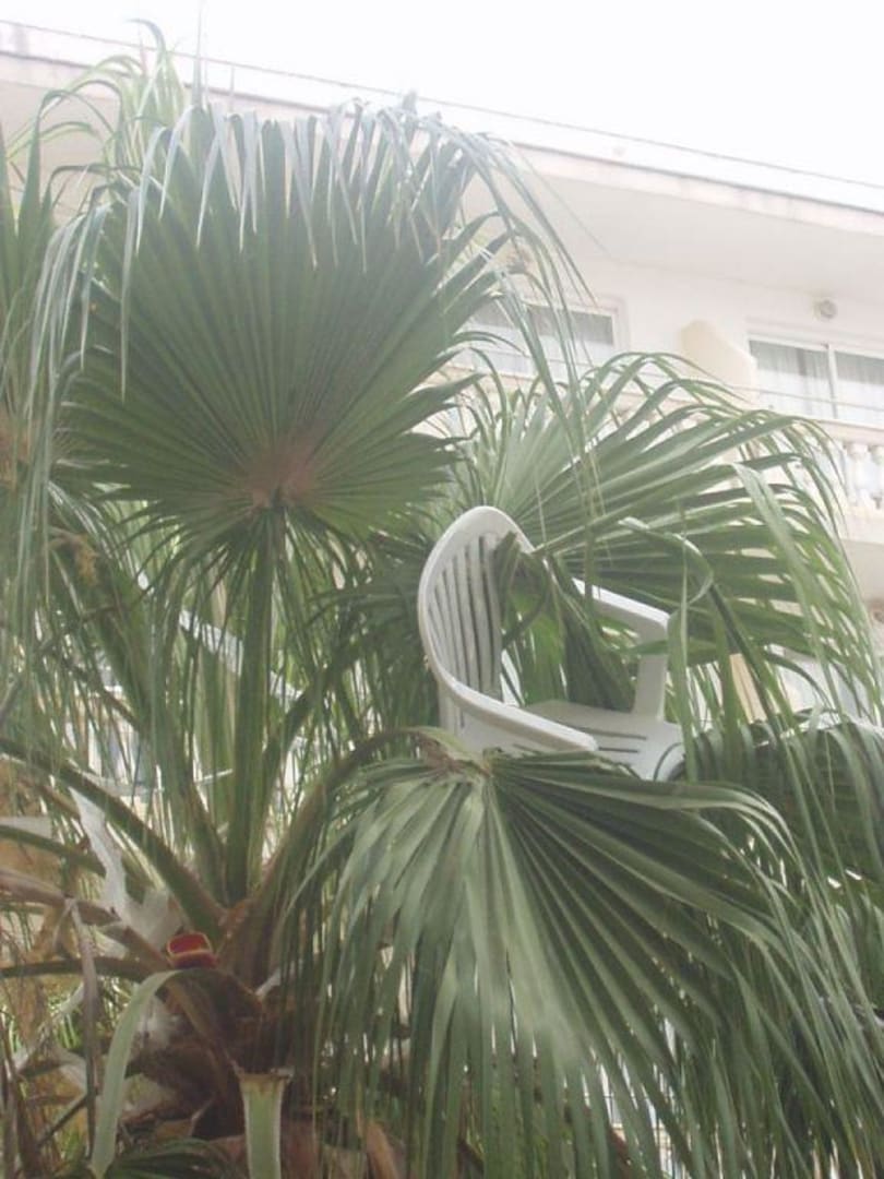 Der Zustand der Hotelanlage war grauenhaft.Die Stühle in den Palmen waren ja nicht das einzigste.Klopapier, Handtücher und sonstiges hingen ebenfalls dort drin.Und keiner hat das weg geräumt...Grauenvoll...