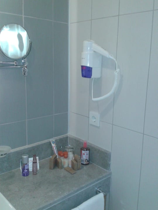 Ablage am Waschbecken mit Föhn und Kosmetikspiegel
