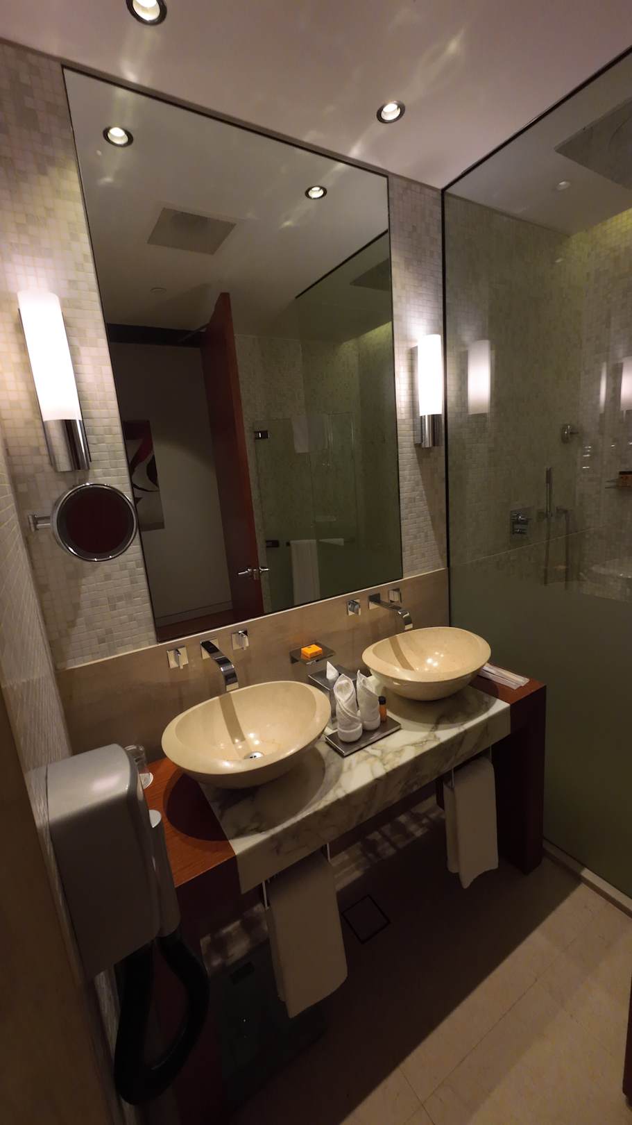 Bad mit his&hers Waschbecken, Fön, (Regen-)Dusche, ausreichend frischen Handtüchern und allen erforderlichen Amenities (Zahnpasta, Seife, Duschgel, Shampoo, Bodylotion, etc.). Fehlte nur eine WC-Bürste auf der Toilette/Bidet.