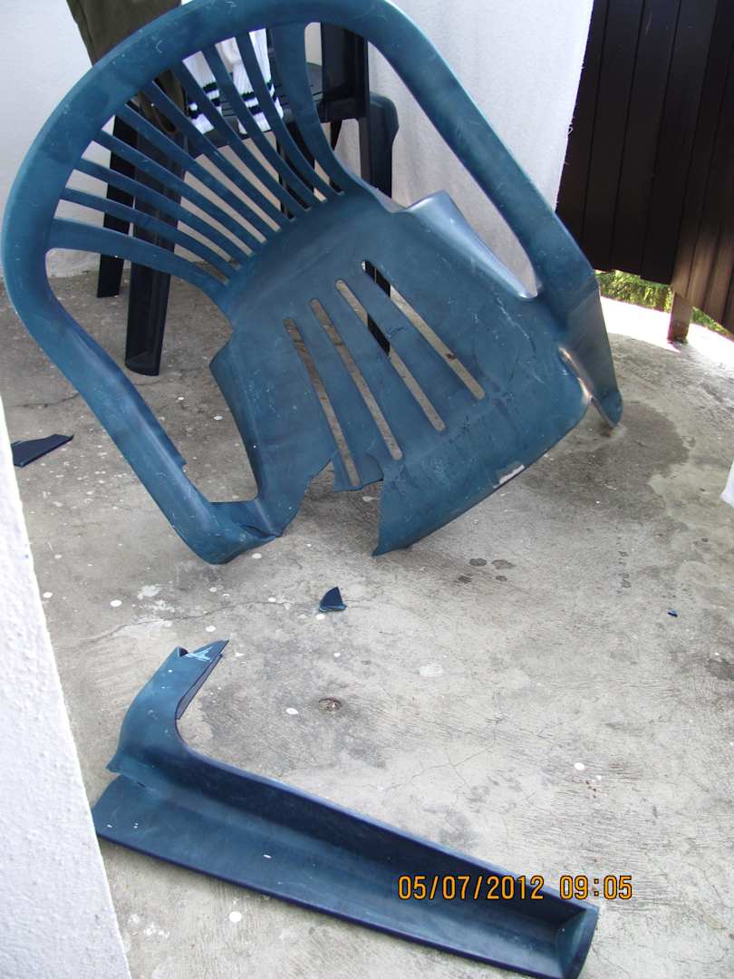 Stare połamane pode mną krzesło ogrodowe.
