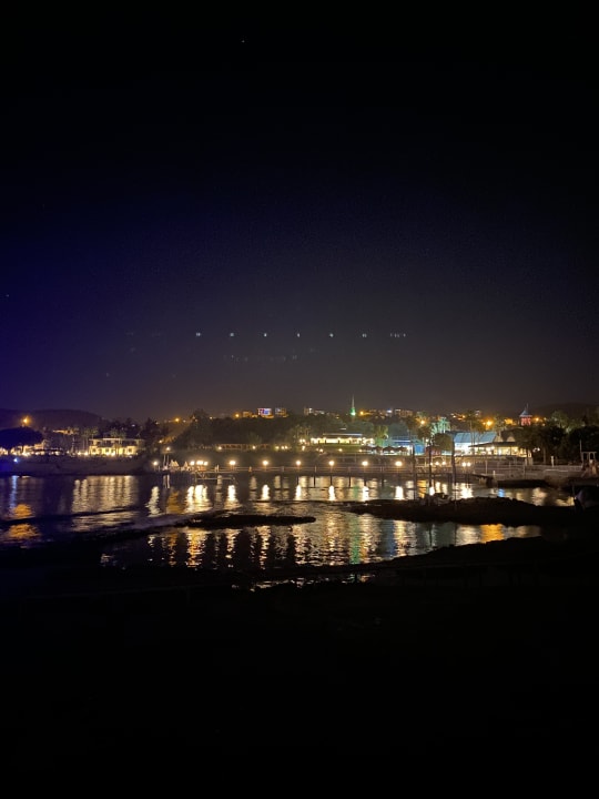 Man kann vom Strand aus auf einem Steg über die Felsen spazieren. Hier sieht man die Aussicht von Steg auf die beleuchtete Hotelanlage am Abend. Super schön!