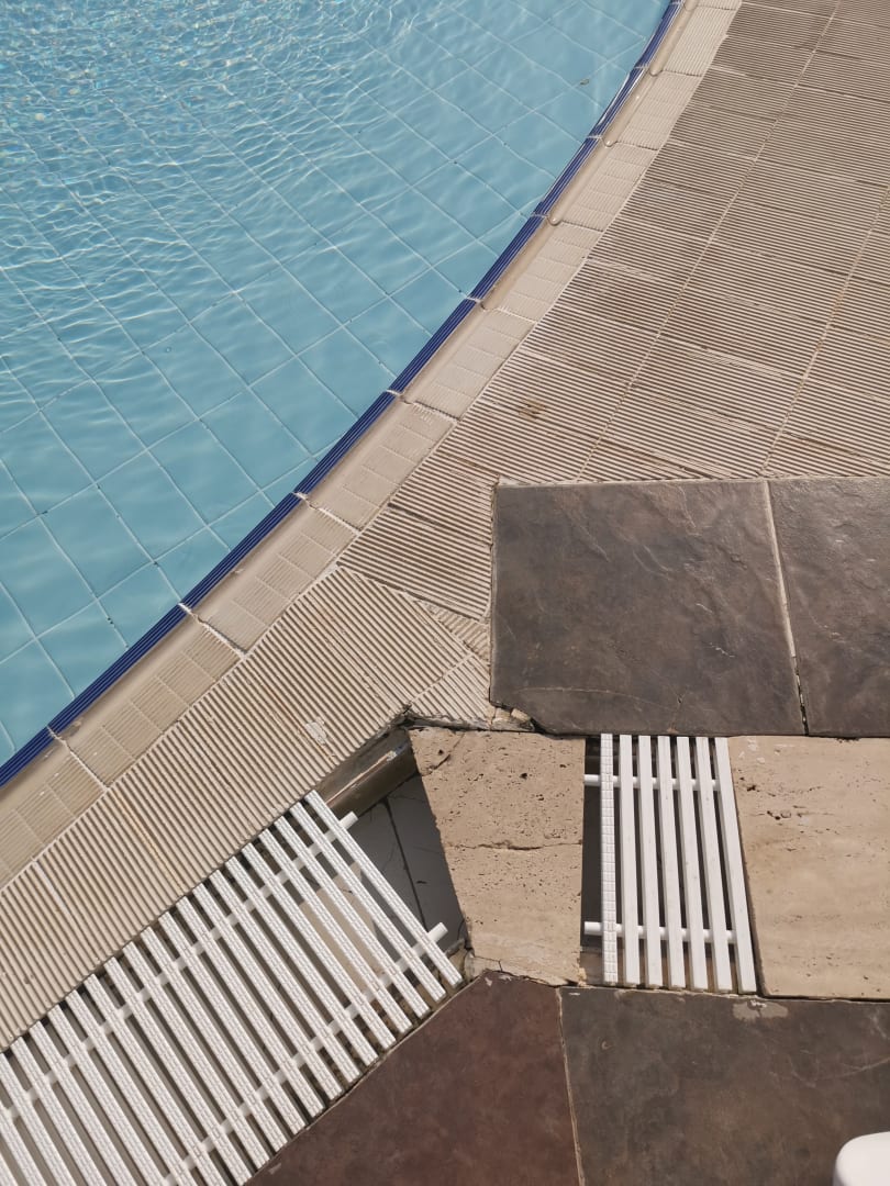 Das ist DIREKT am baby Pool. Wenn da ein kleines Füßchen rein tritt.... Scharfe kanten und leider überall am Pool. Und meeeega Rutsch Gefahr mit und ohne Schuhe legt sich jeder 3. Auf den Hintern