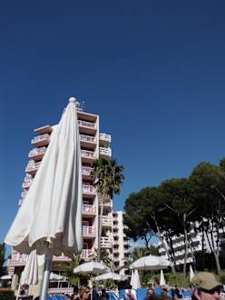 Blick vom Pool auf das Hotel