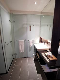 Offenes Bad mit abgetrennter Toilette und Dusche