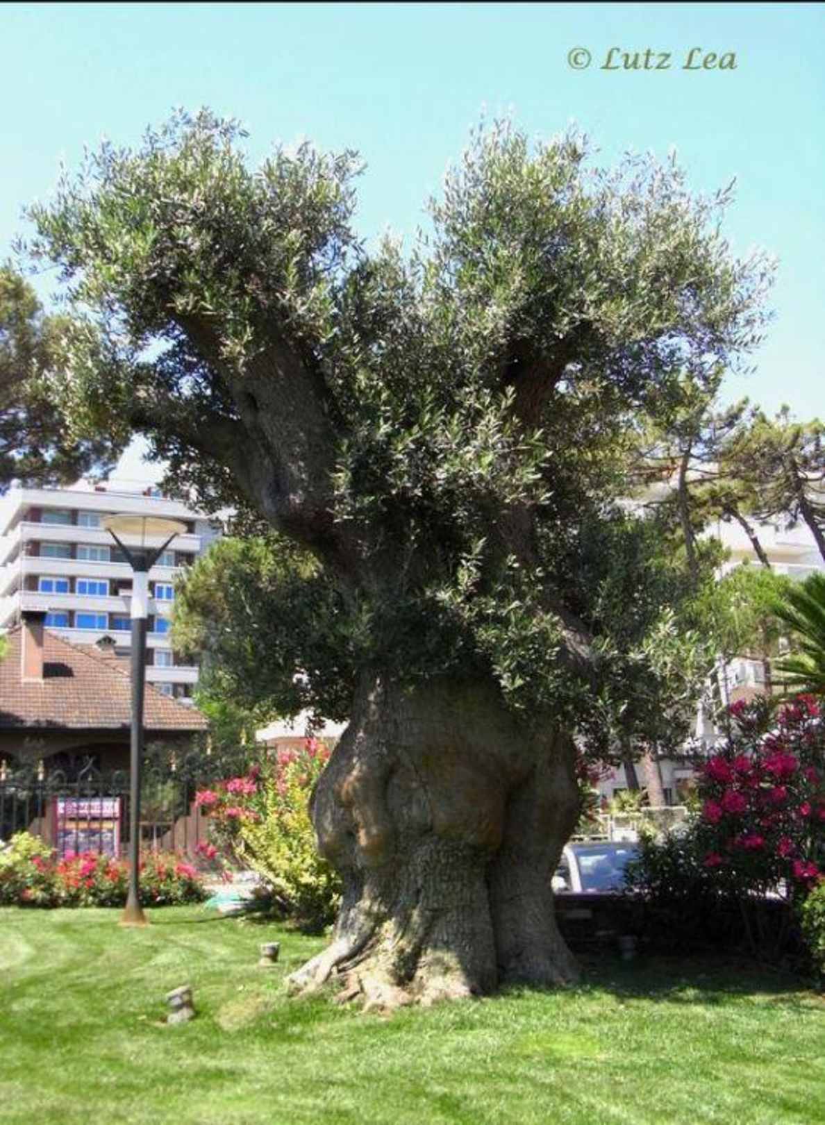 Knorrige, markante und alte ausgepflanzte Olive vor dem Hotel Palace.