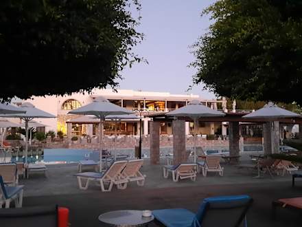 Blick über den Pool zur Bar (unten) und Restaurant (oben)