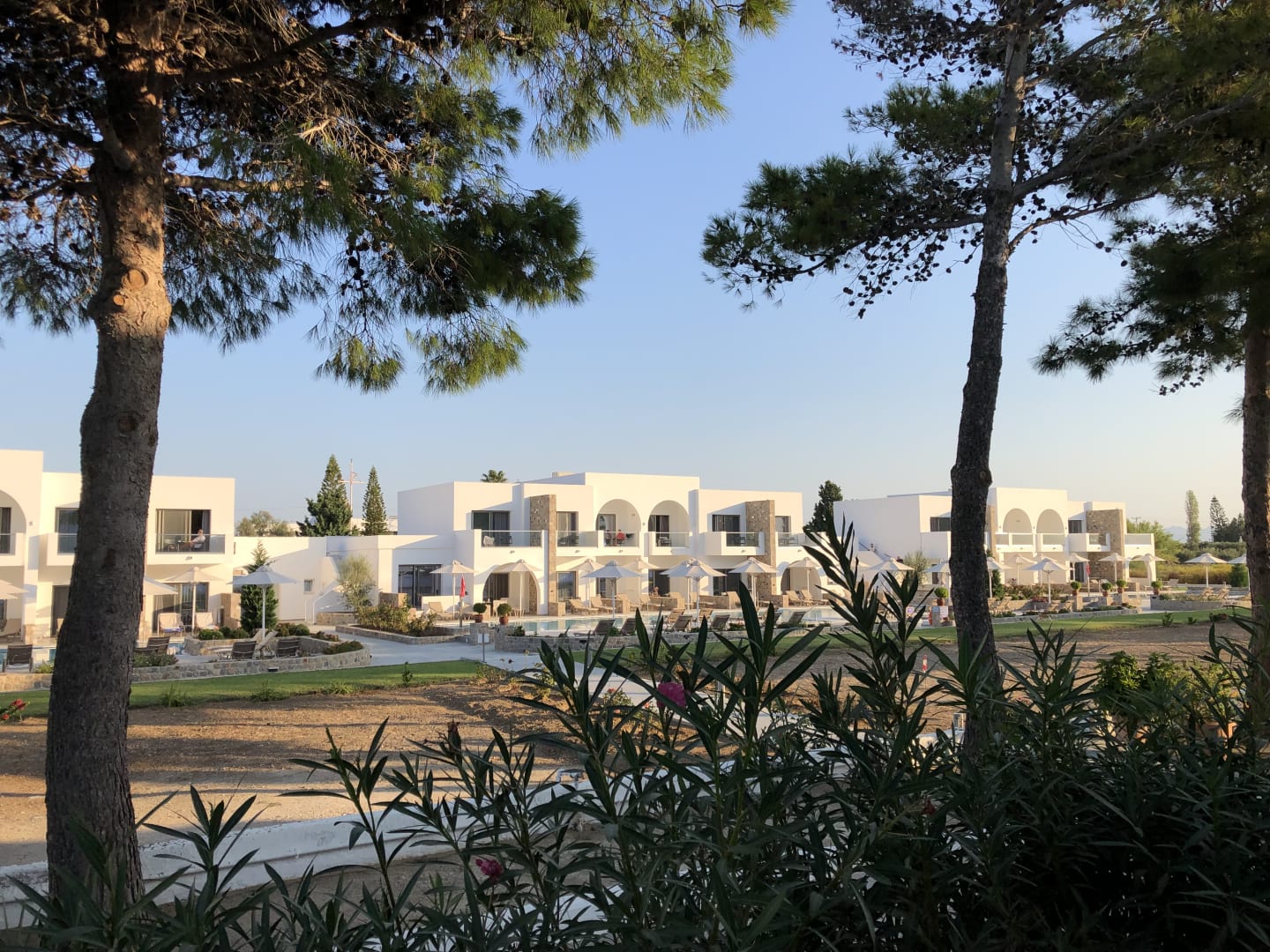 Blick vom Hauptgebäude zum Neubau des Hotels