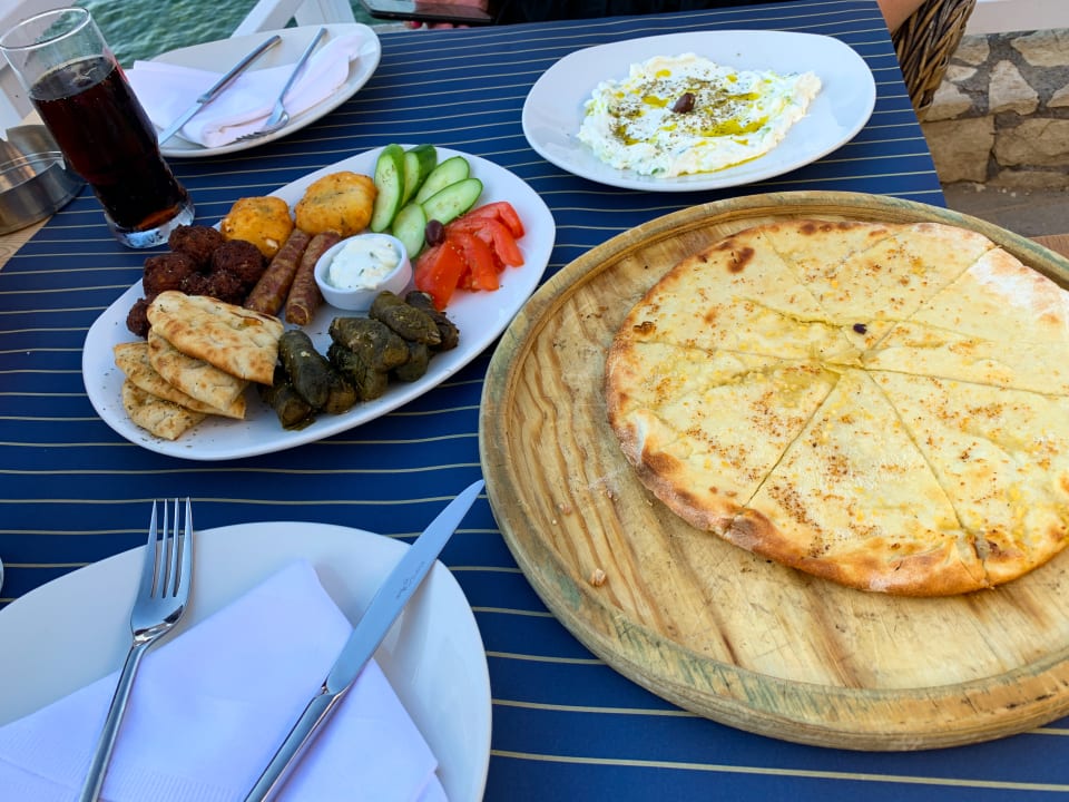 Meze-Teller, Tzatziki und Knoblauchbrot im "Palmera Seaside" Restaurant