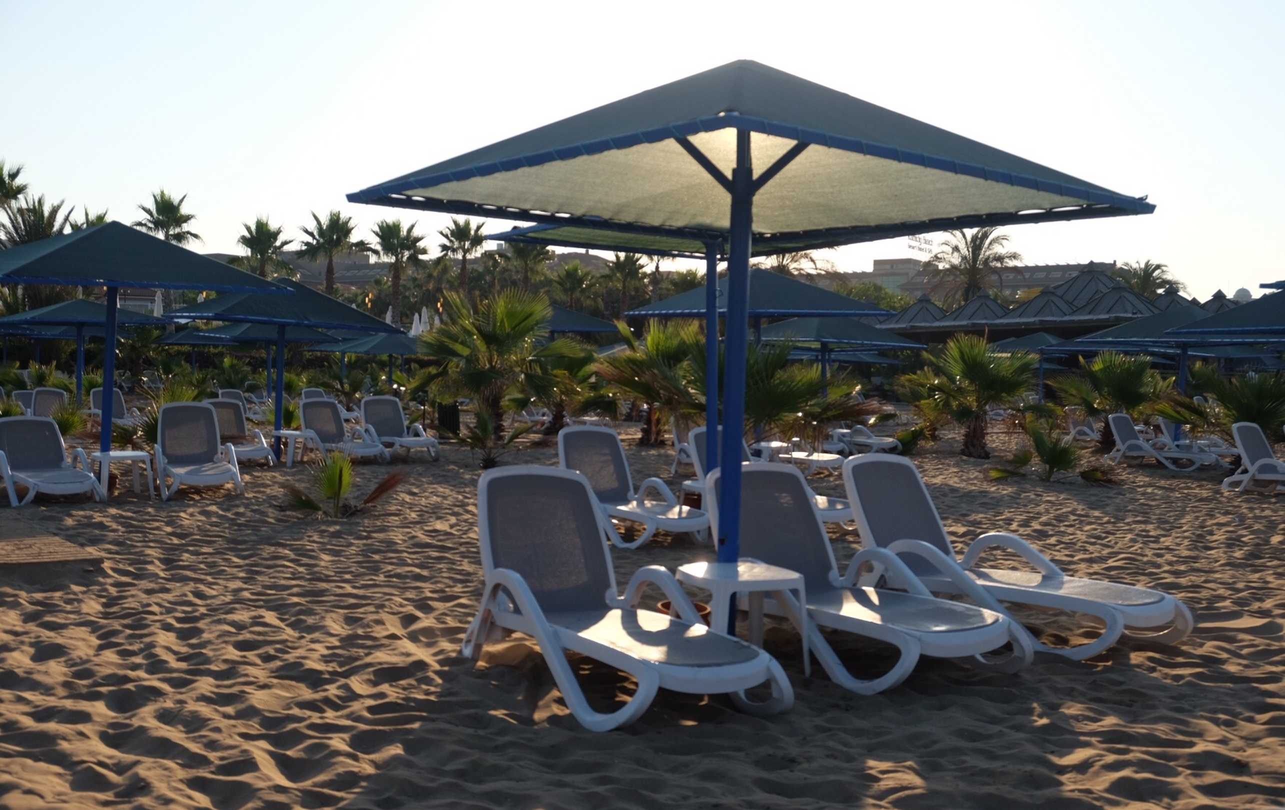 StrandDie Liegen und Sonnenschierme am Strand. Genügend Platz um in alle Richtungen auszuweichen und ggf. mit dem Schatten mitzuwandern.