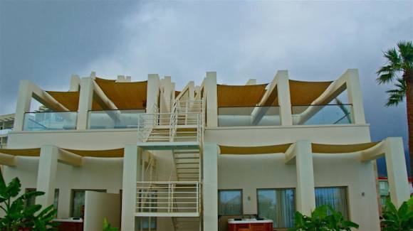 Die nachträglich eingebaute Feuertreppe bei den Terrassensuiten