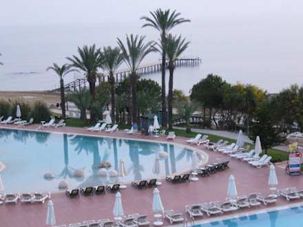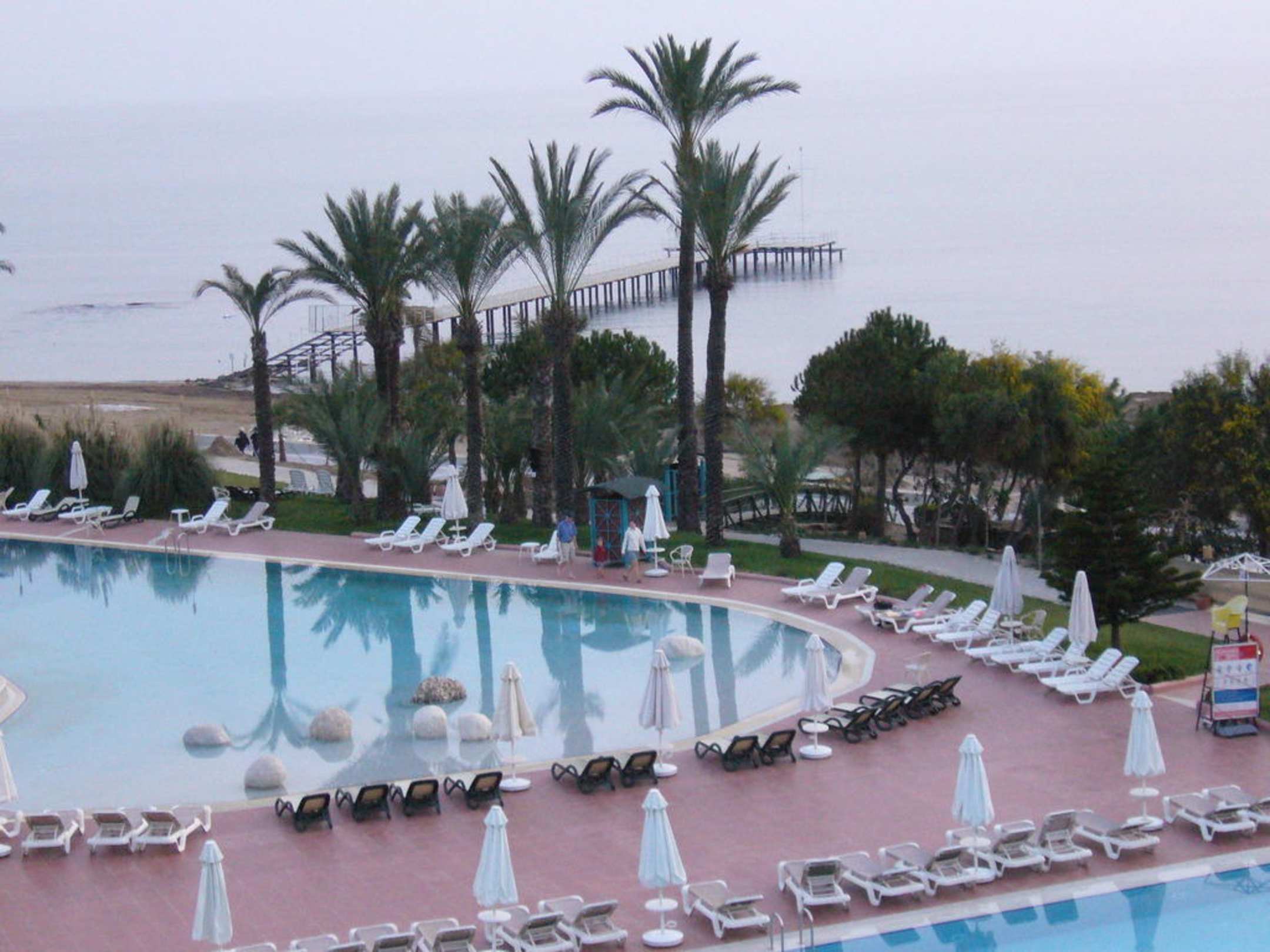 Vom Zimmer auf ein Teil der Poolanlage im Hintergrundsieht man den Steg , wo man im Sommer die Wasser Schildkröten sehen kann.