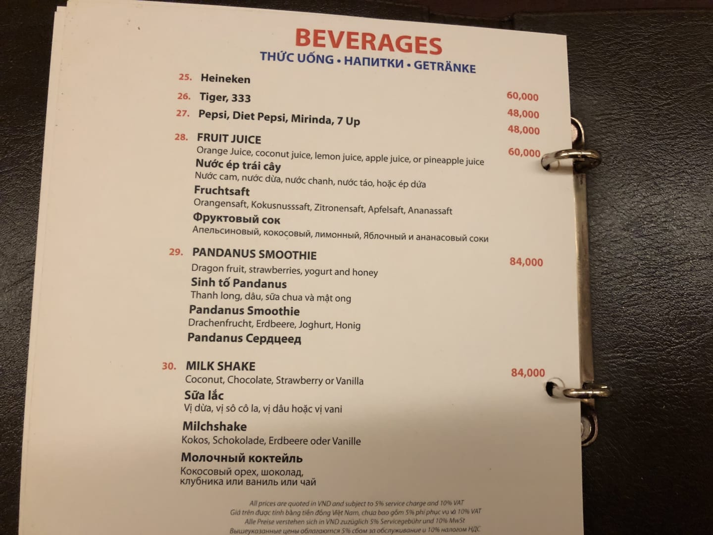 Roomservice Karte (letzte Seite)