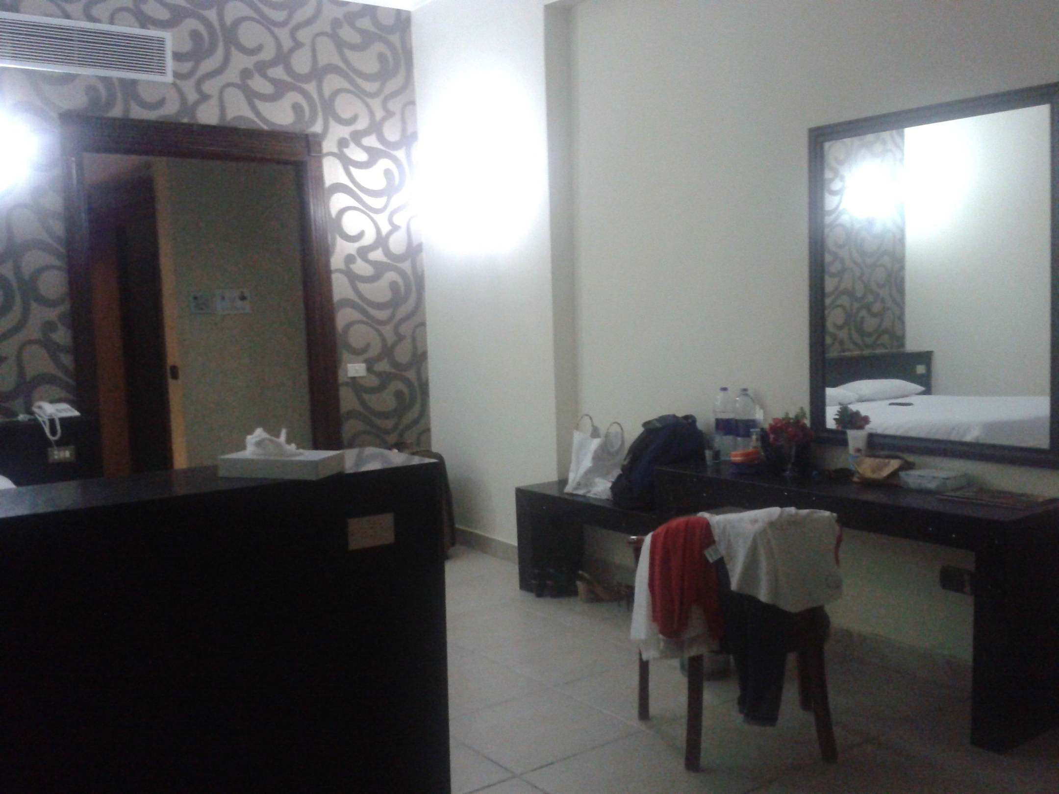 Вид номера с дивана слева трюмо, виден вход номер.