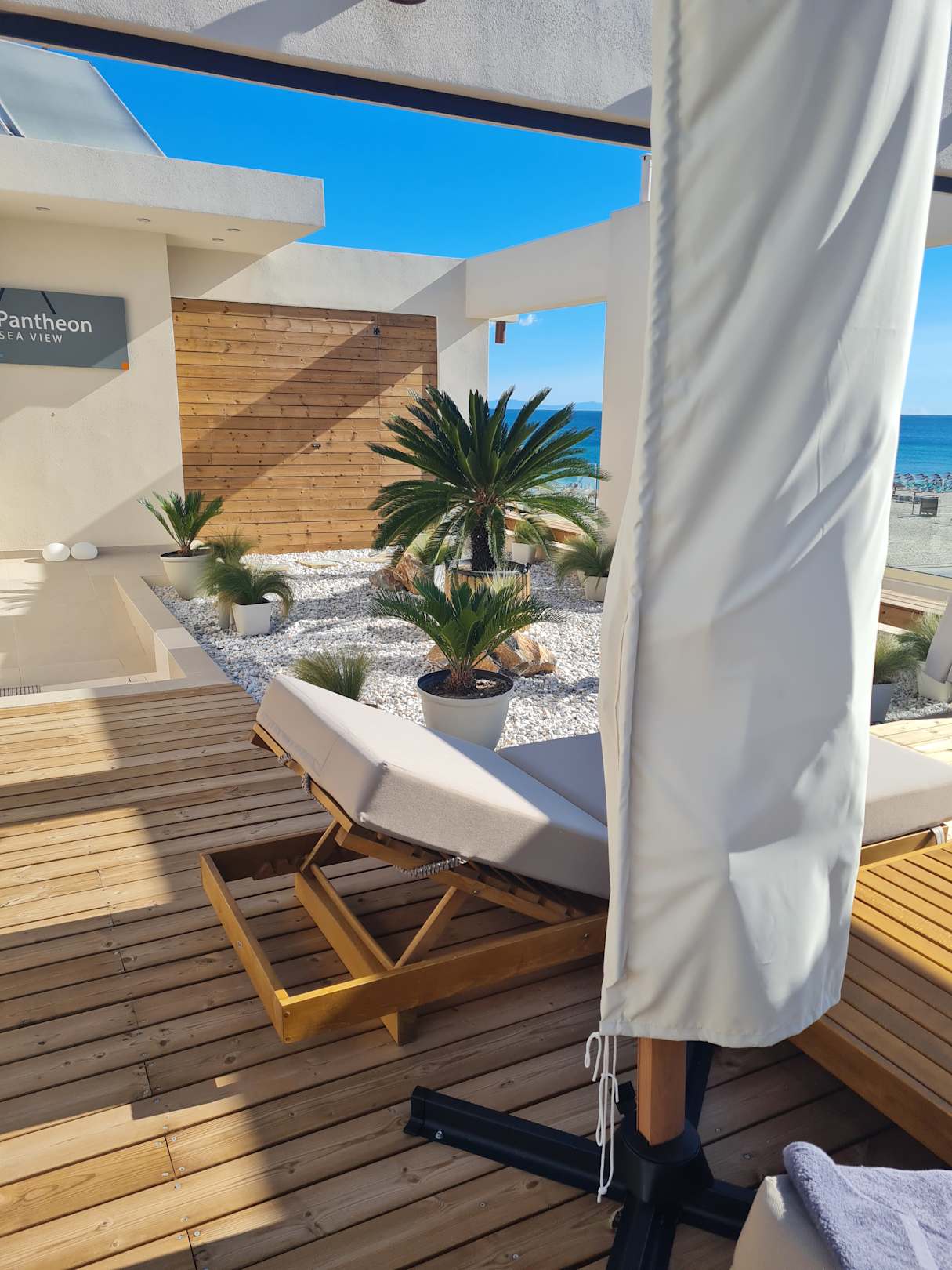 Weiteres Bild der Dachterasse/Whirlpool. Hier mit Blick auf den Strand. Es gibt dort verschiedene Sitzmöglichkeiten, zwei Liegen und den Whirlpool. Getränke werden einem auf Wunsch auch gebracht.