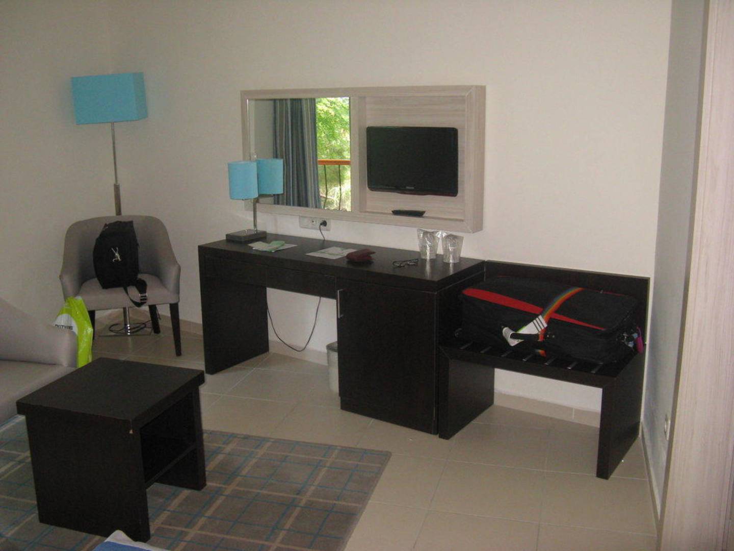 Flachbildschirm , Schreibtisch , Kofferablage und Kühlschrank
