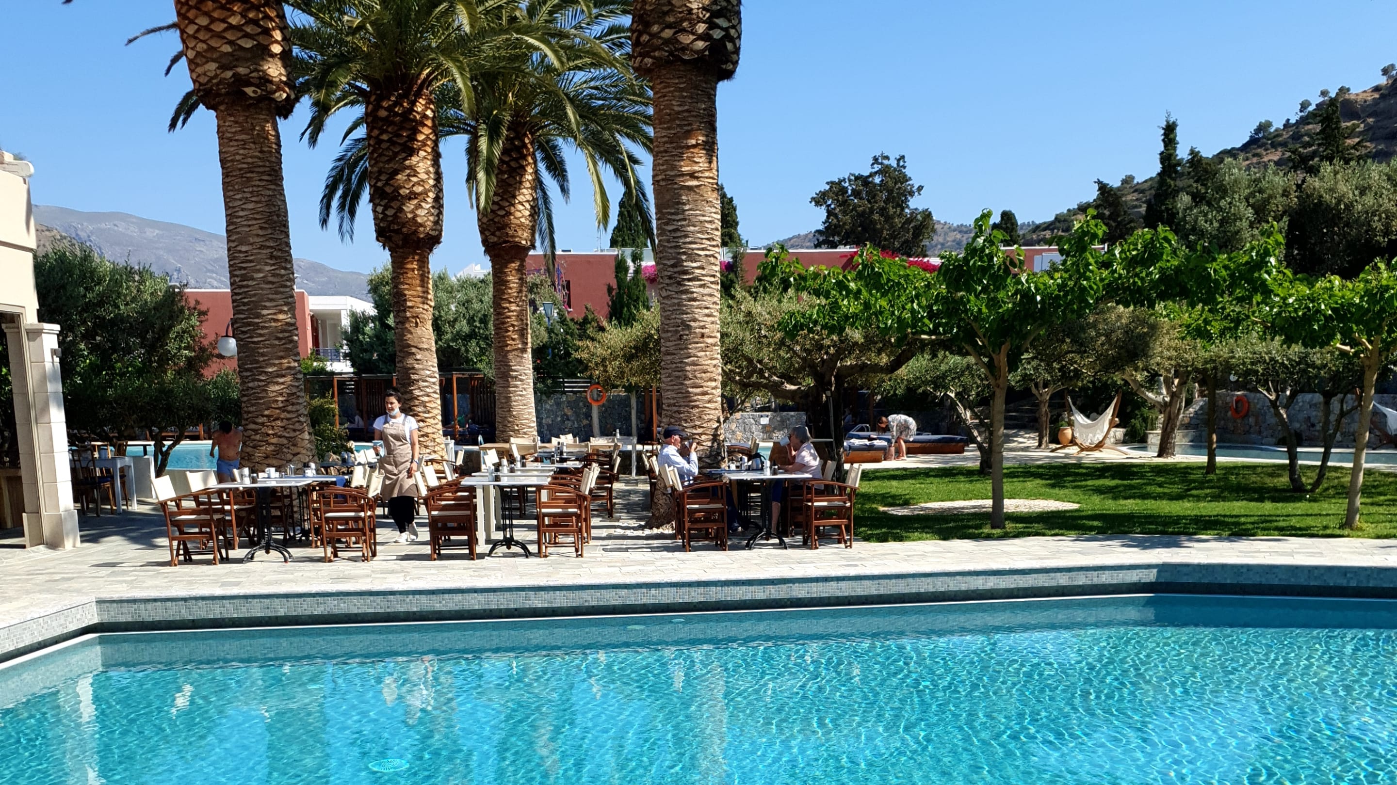 Aussicht auf Pool 1 und Pool 2, sowie Aussenbereich Gastro