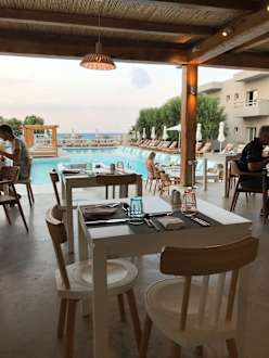 Blick vom Speisesaal auf den Pool und das Meer