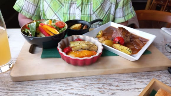 Kalb mit Ofengemüse Rosmarinkartoffeln und Salat