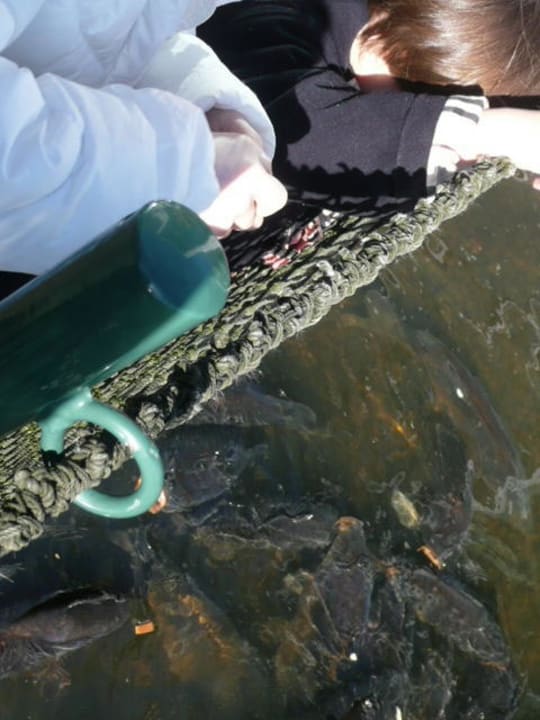 Kinder füttern die KarpfenAuf der Terasse kann man die Hauskarpfen mit altem Brot füttern, welches die Kellnerinnen gerne zur Verfügung stellen.