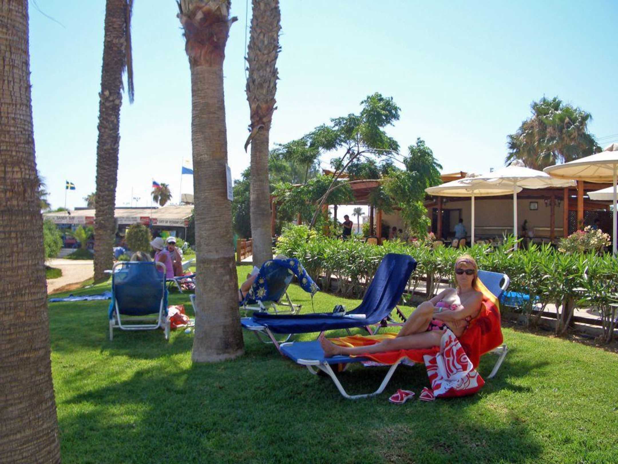 Liegewiese nach dem Poolbereich mit Strandzugang und hoteleigenen Liegestühlen
