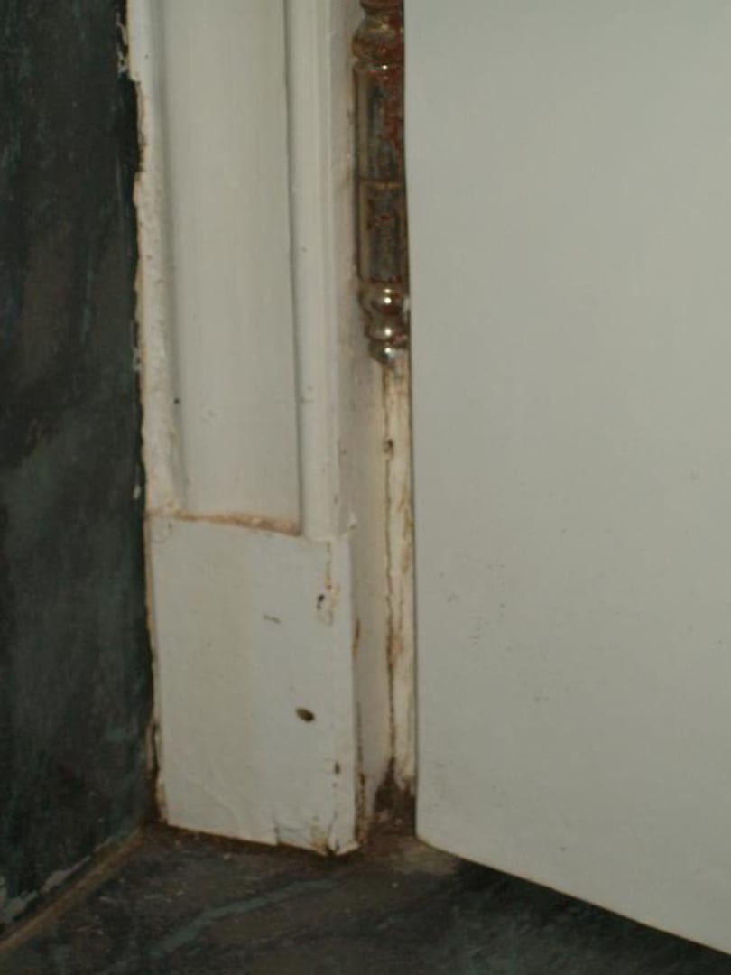 Türzarge verrottet und Türband verrostet, Zarge wurde nur notdürftig repariert.
