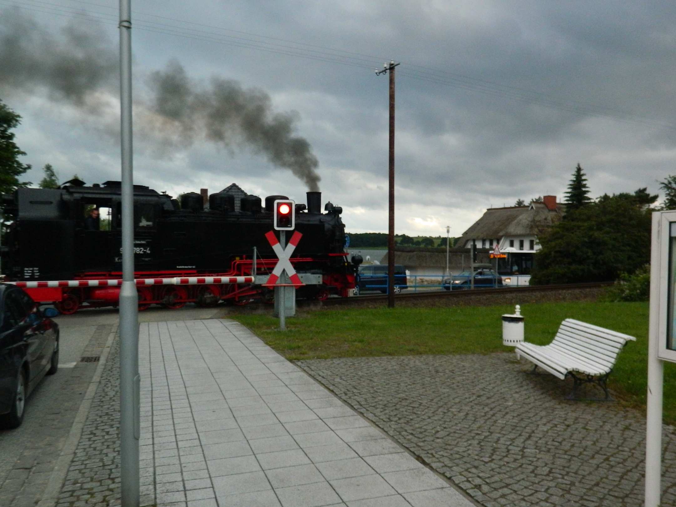Rasender Roland mit Haus im Hintergrund