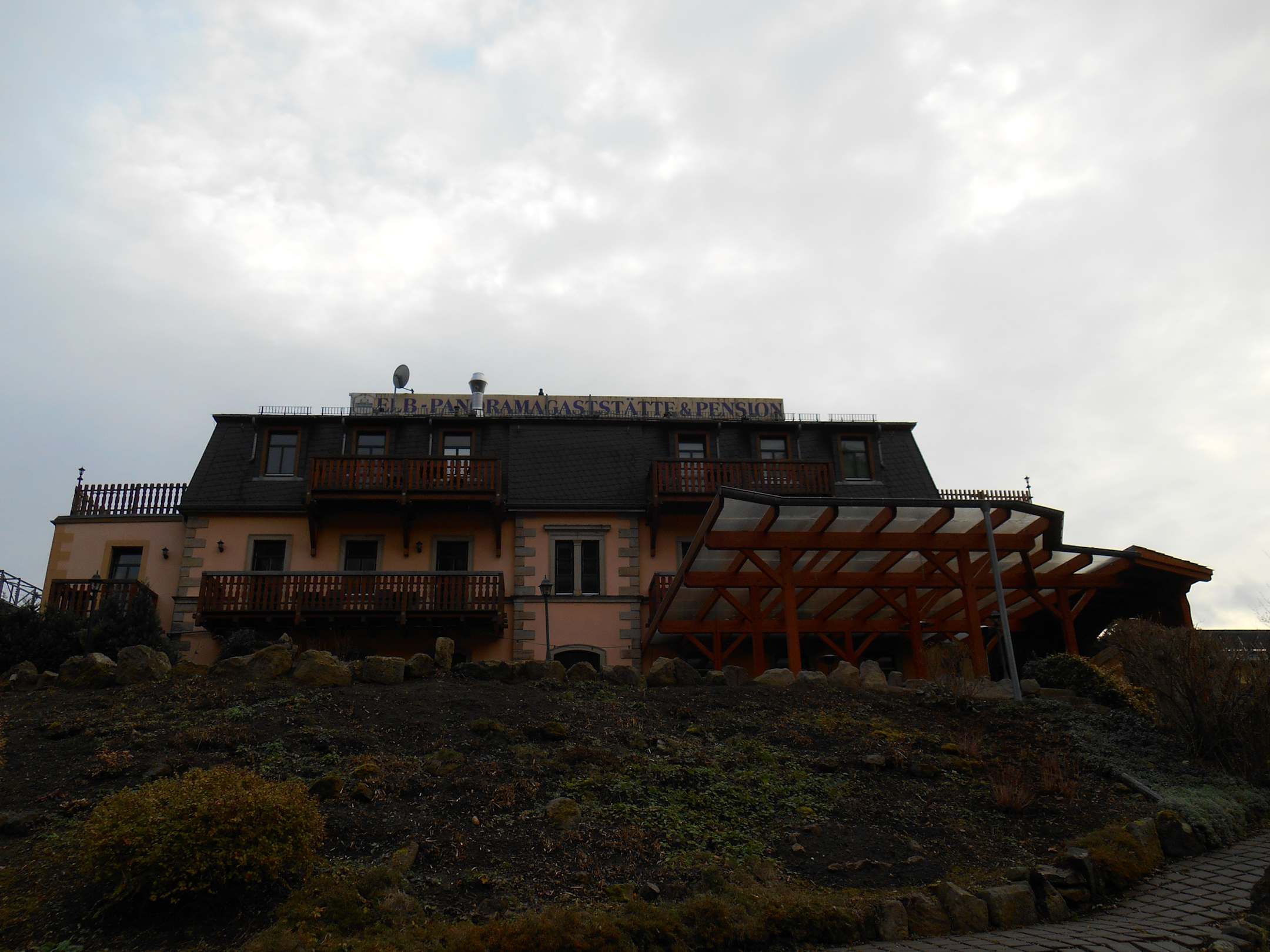 Außenansichtvon der Elbe aus fotografiert, da war unser Zimmer oben links mit der Terrasse an der Stirnseite