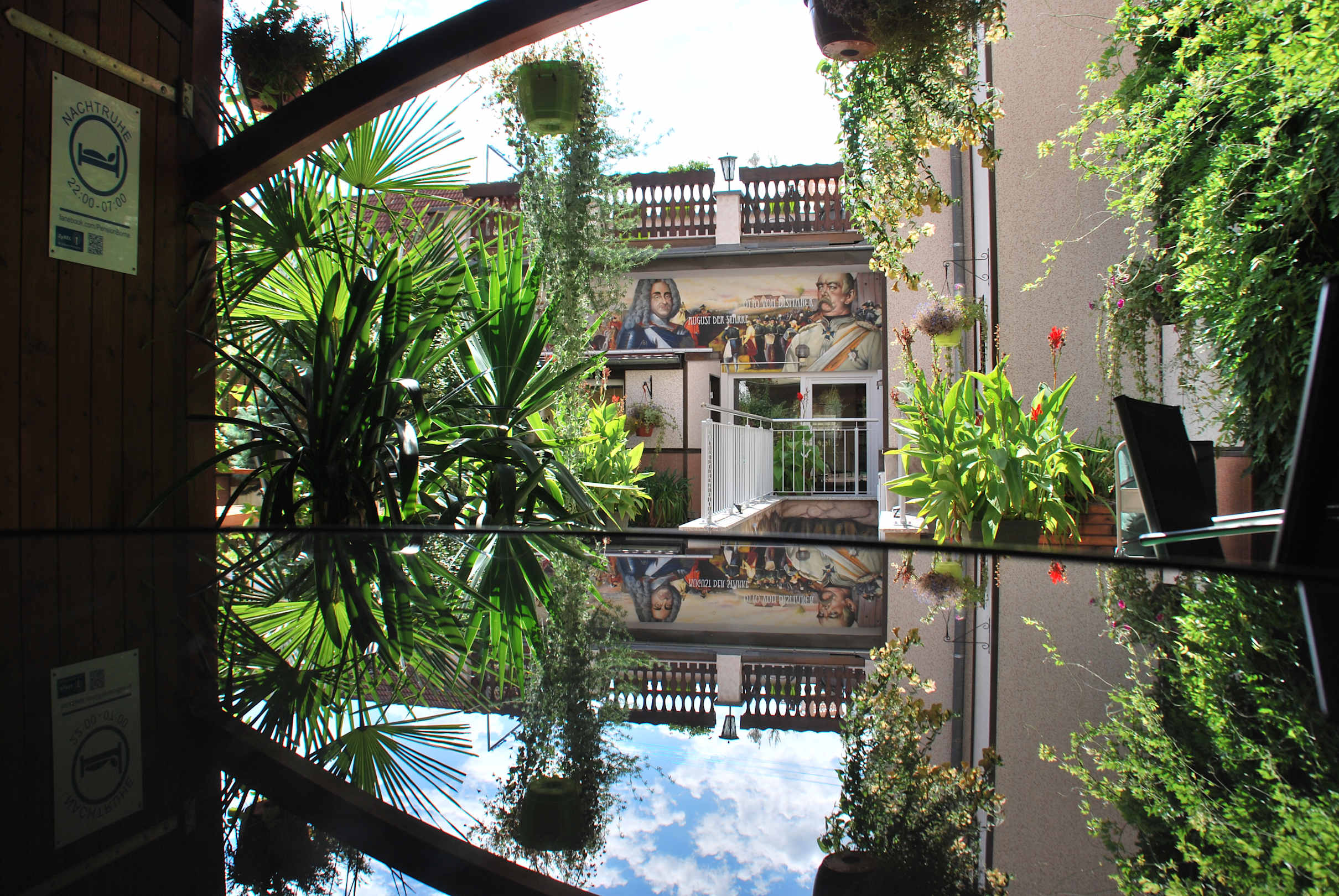 Toller Hof inmitten von historischen Bildern und Blumen.