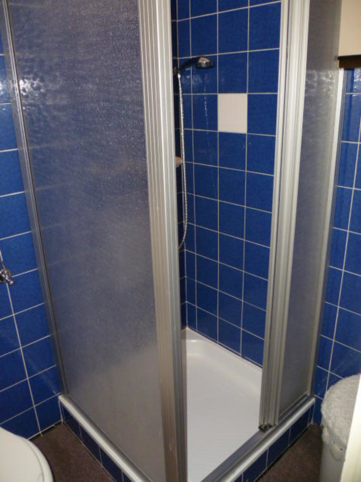 Dusche, klein aber sehr sauber.