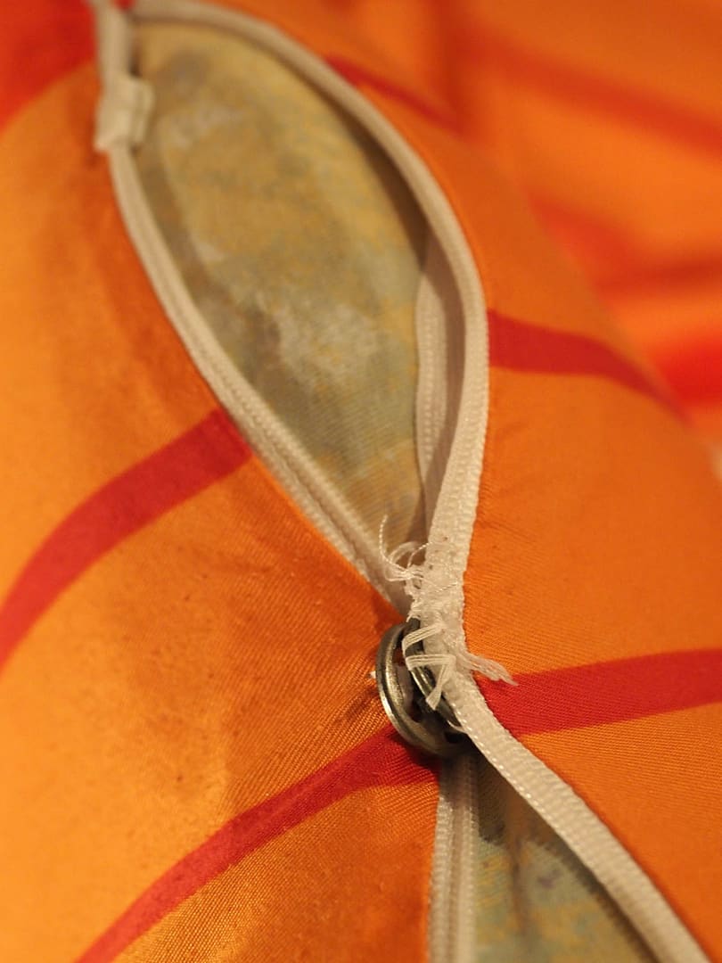 ZimmerNotdürftig mit Druckknöpfen geflickter, defekter Reissverschluss am Kopfkissen (Inlay besser nicht anschauen)
