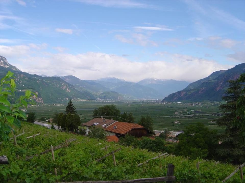 Pension EtschblickZu sehen ist eine Außenaufnahme der "Pension Etschblick" hier: Blick vom Eingang der Pension in die Berge.