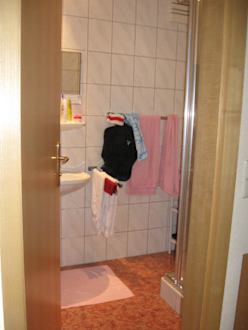 Kleines Bad mit großer Dusche und Waschtisch.WC war seperat.