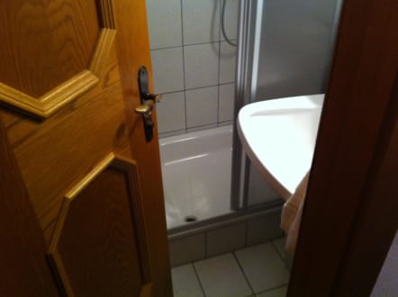 Sehr kleines Bad. Man muss in die Dusche steigen um die Tür hinter sich zu schliesssen. Leider nicht so groß wie auf der Homepage des Anbieters!