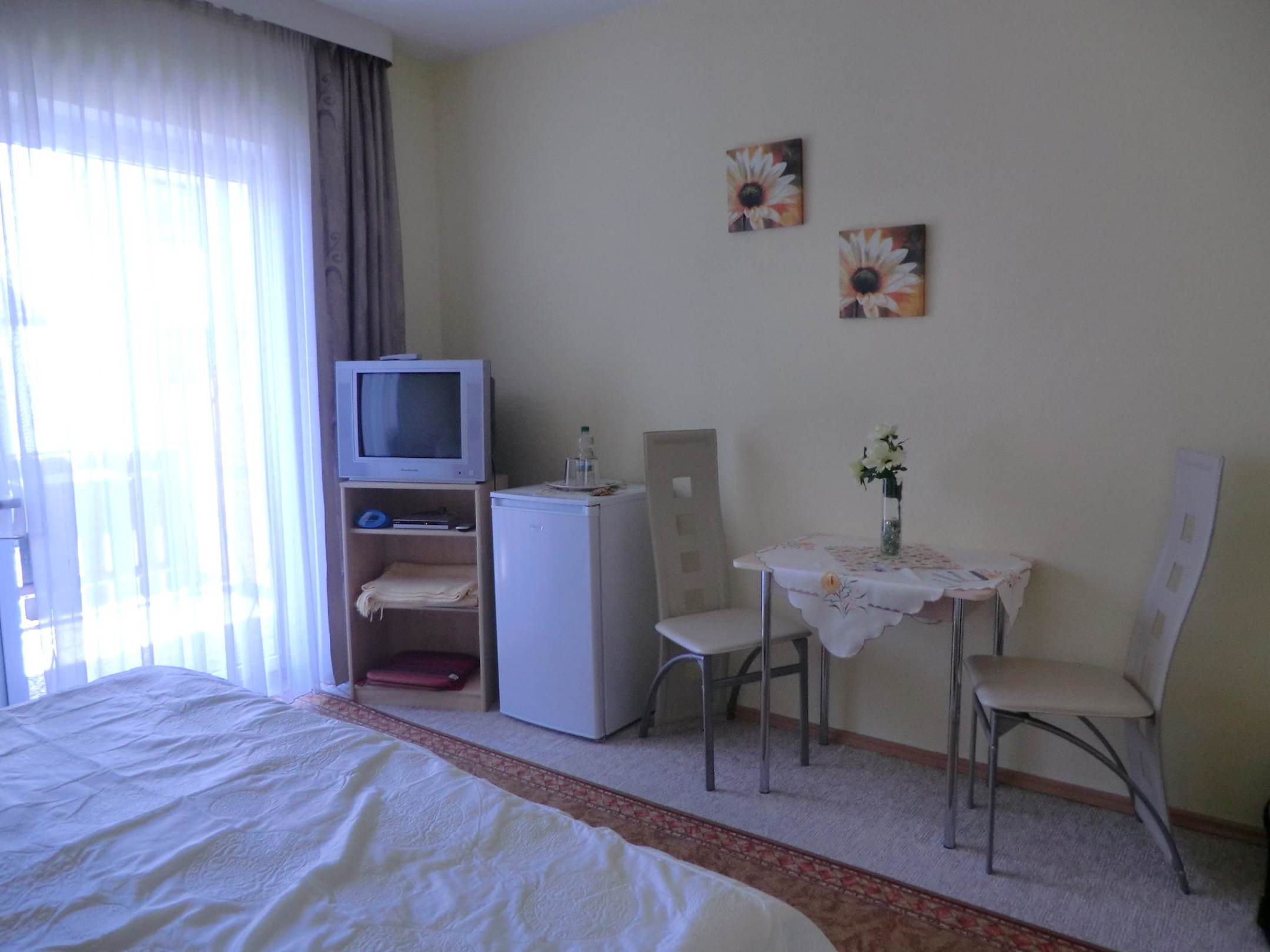 Doppelzimmer mit Tisch, 2 Stühlen, Kühlschrank, Fernseher.