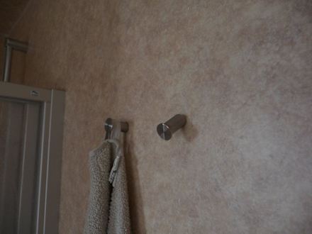 BadezimmerhakenDer eine Haken ist heraus gerissen und nicht mehr benutzbar. Auch hier wieder schön der Wandbelag (PVC) zu sehen.