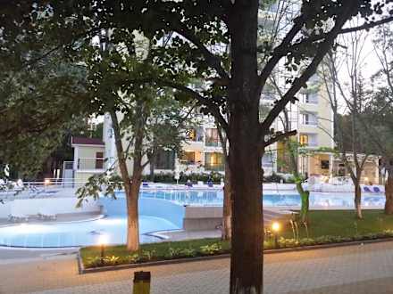 Blick nach dem Abendessen aus dem Restaurant Richtung Hotel.