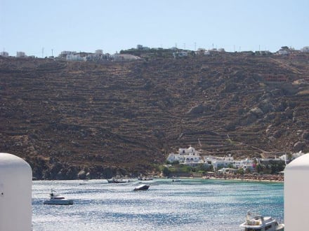 Blick vom Hotelzimmer auf den Strand von Psarou