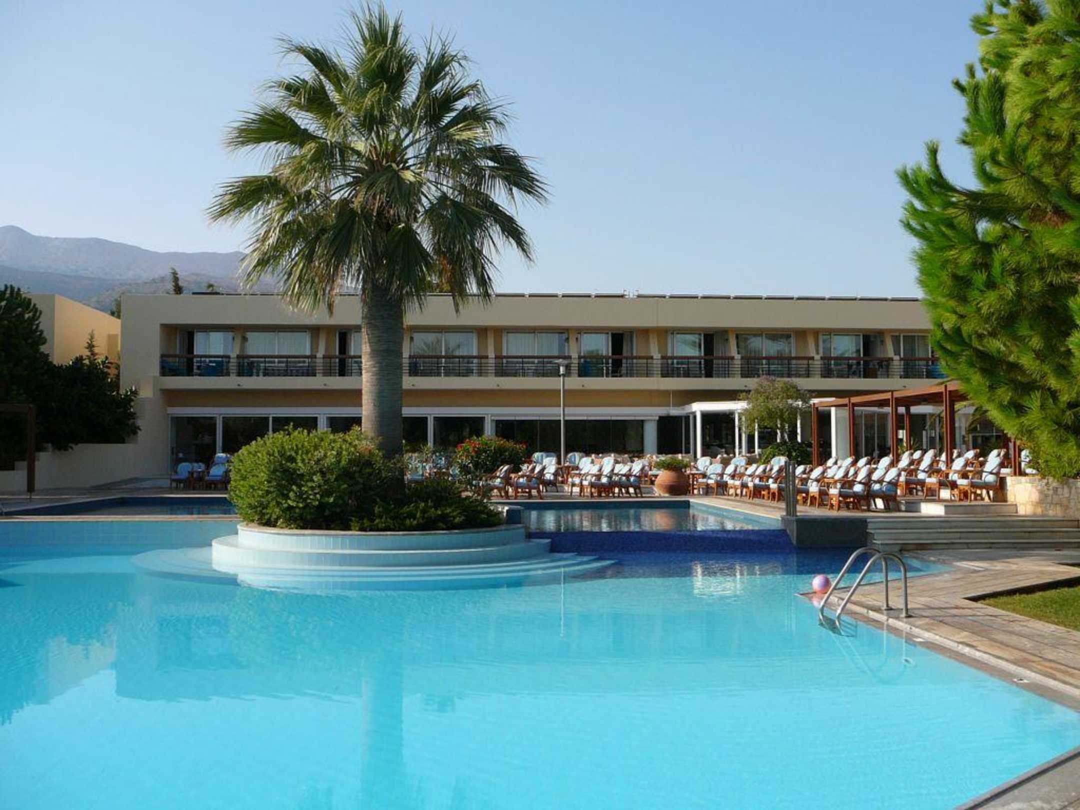 Hauptpool mit Haupthaus im HintergrundDer Hauptpool befindet sich direkt am Haupthaus. An diesem Pool finden auch die abendlichen Unterhaltungsshows der Animateure statt. Der zweite Pool (Wellnesspool) befindet sich weiter in Richtung des Hotelstrandes.