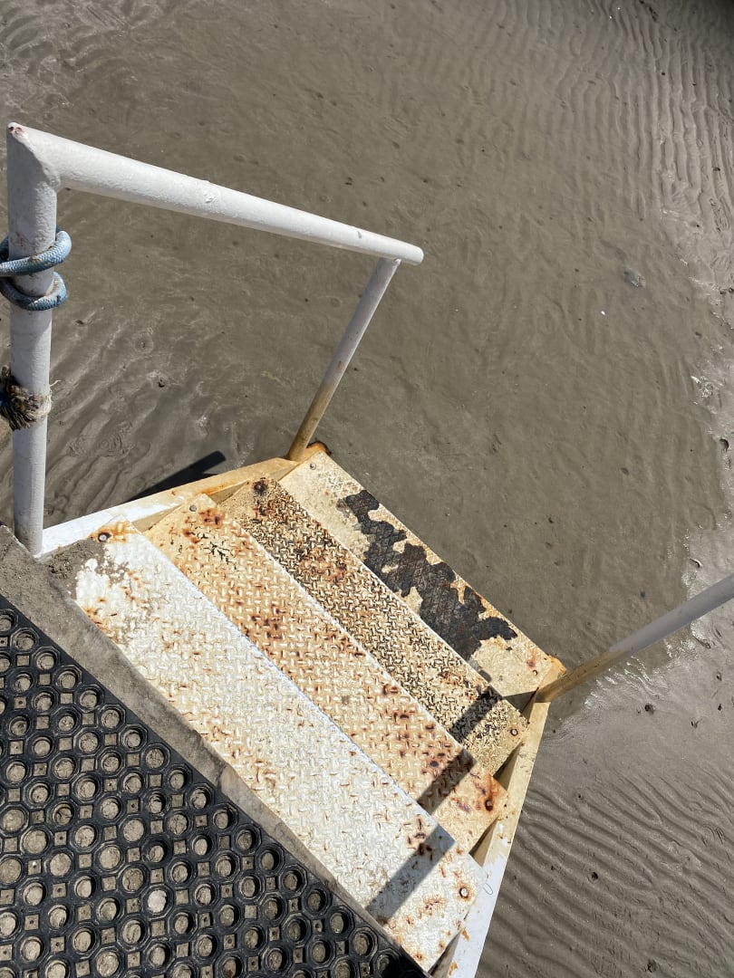 Der Einstieg vom ca.100m langen Steg ins nicht vorhandene Wasser