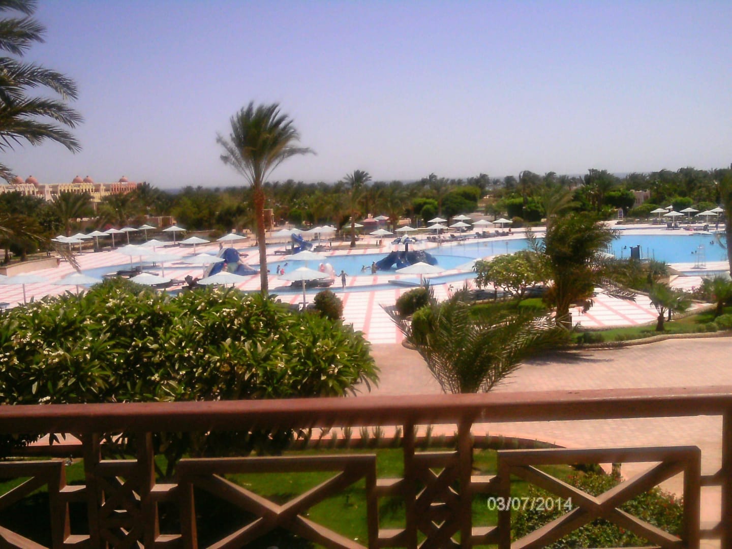 Aussicht vom Haupthaus auf die Poolanlage