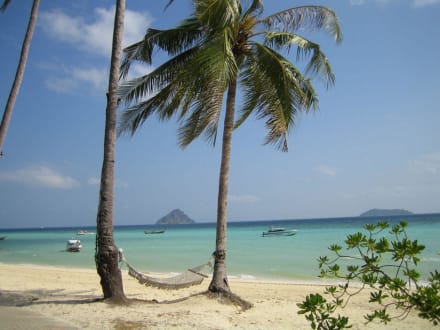 hängematte am strand. mit blick auf moskito island (links) und bamboo island (rechts).