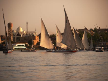 Direkt vor dem Hotel kreuzen Feluken auf dem Nil. im Hintergrund die koptische Kathedrale und die Nilinsel Elephantine