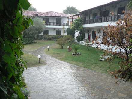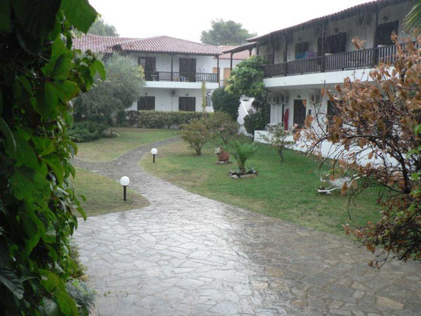 HotelanlageEin kurzer und erfrischender Septemberregen. Blick vom Außenbereich des Restaurants in die Anlage.