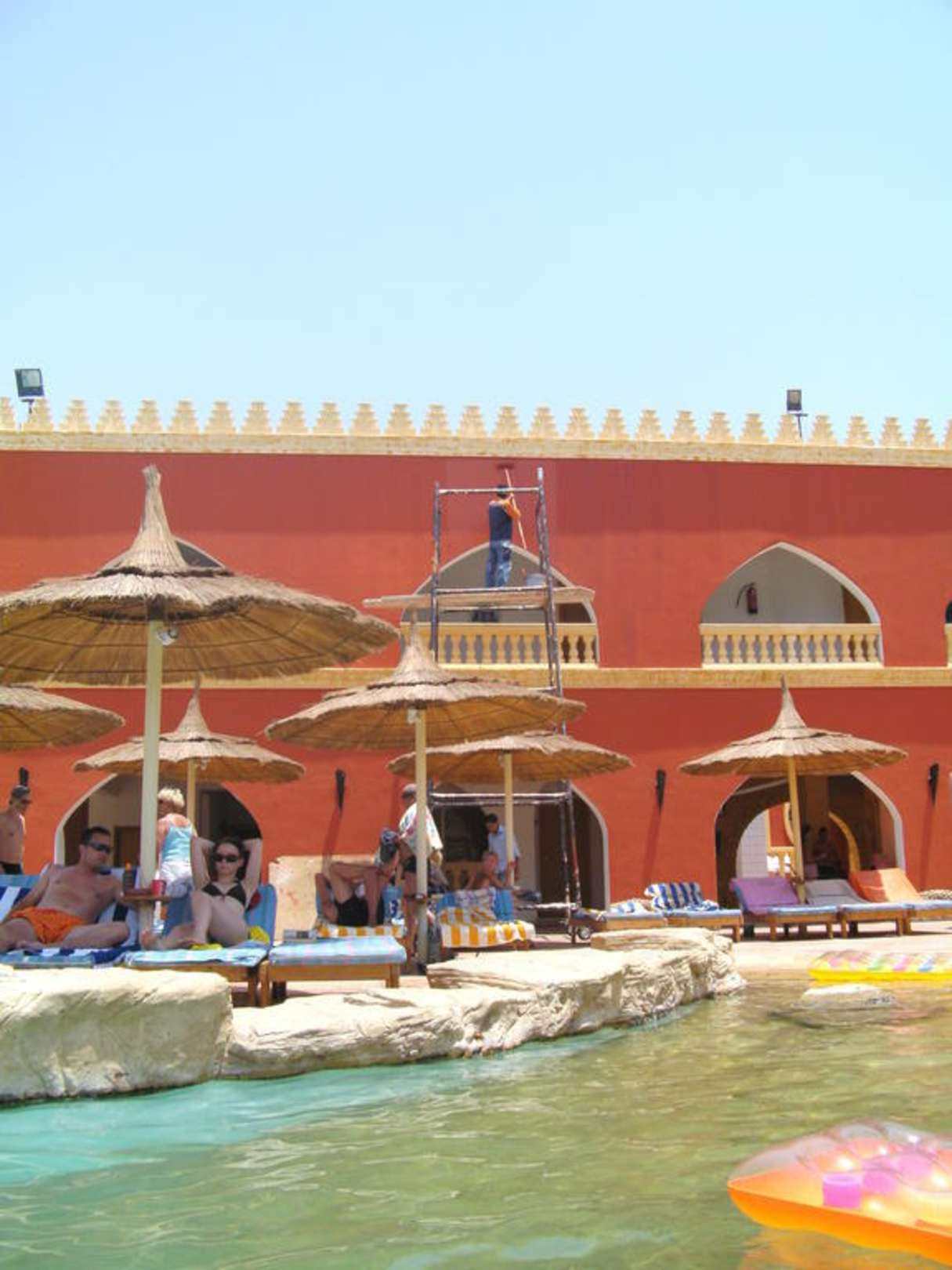 ...kaum Platz am Pool für Liegen... da kommen die Maler mit Ihrem Gerüst und schieben auch noch die Liegen (mit Gästen drauf) beiseite um das Gerüst weiter zu fahren... zum Entspannen nicht gerde schön und unverantwortlich.