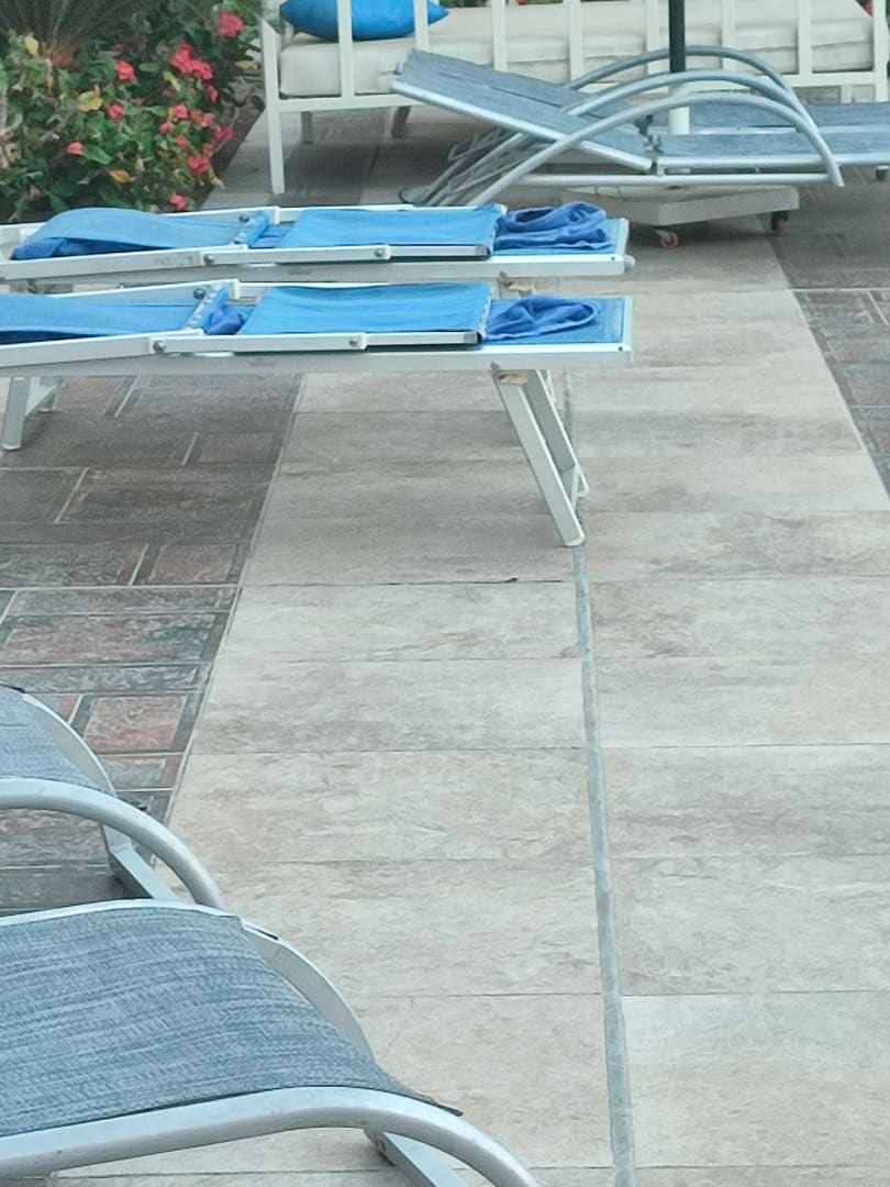 Selbst die Liegen, die noch im Schatten liegen werden dauerhaft von den Gästen reserviert. Hier vor ihren Zimmern. Matratzenauflagen werden sogar teilweise mit auf die Zimmer genommen.