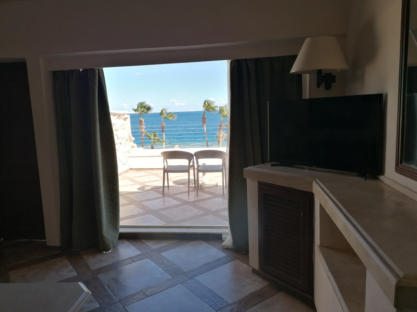Zimmer 5110 Blick über die Terrasse zum Meer.