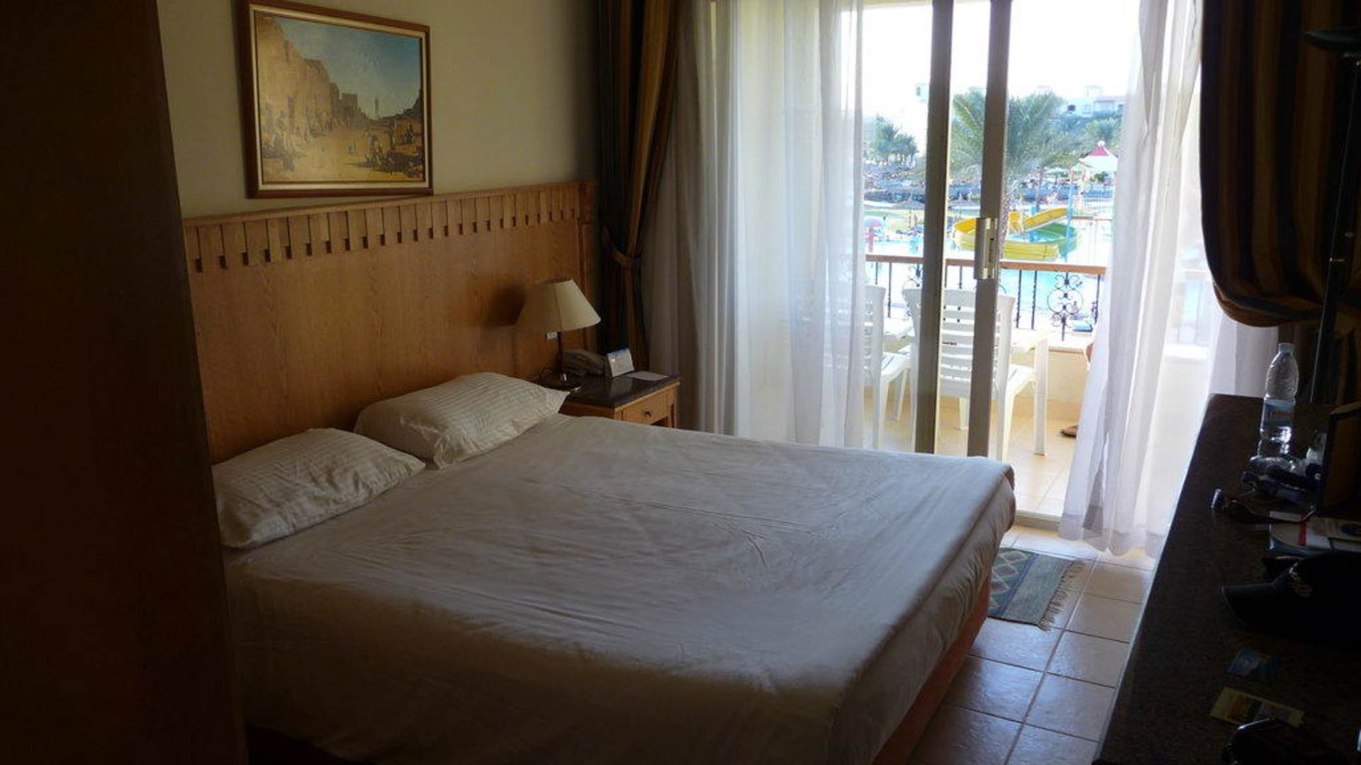 Doppelbett mit Blick auf Poolanlage