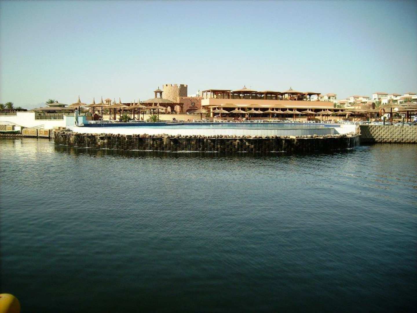 Die Lagune mit den dahinter liegenden Pools und dem Castello