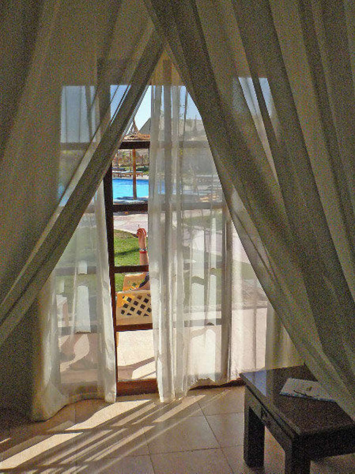 Blick aus dem Zimmer auf Terrasse und Pool