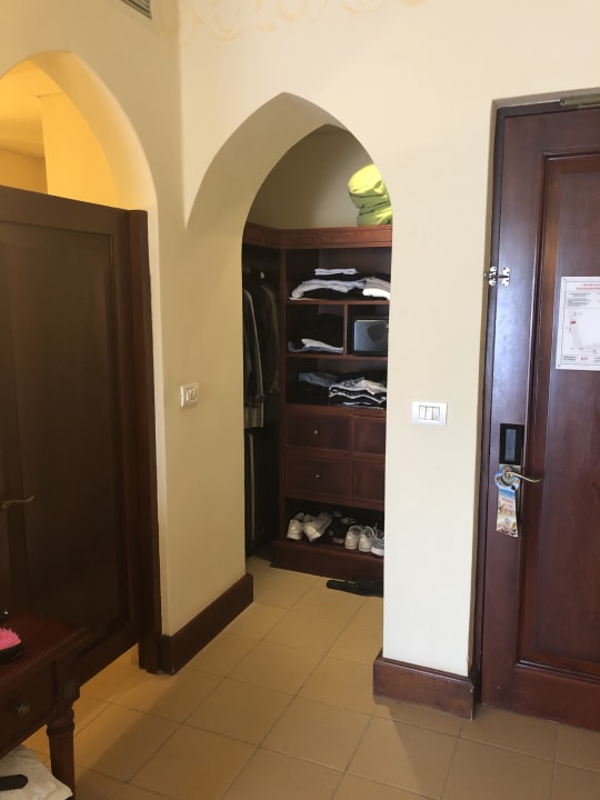 Links Tür zum Bad, oben und unten offen. Dahinter der der Schrank.